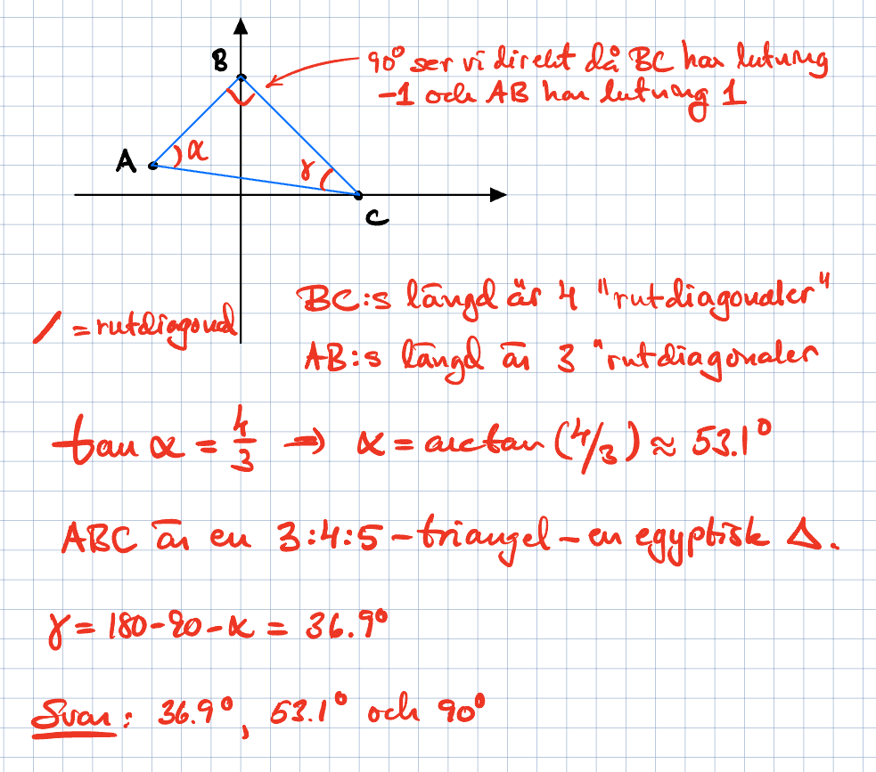 Bestäm alla vinklar i triangeln ABC, där hörnens koordinater är A=(-3,1) B=(0,4) C=(4,0)