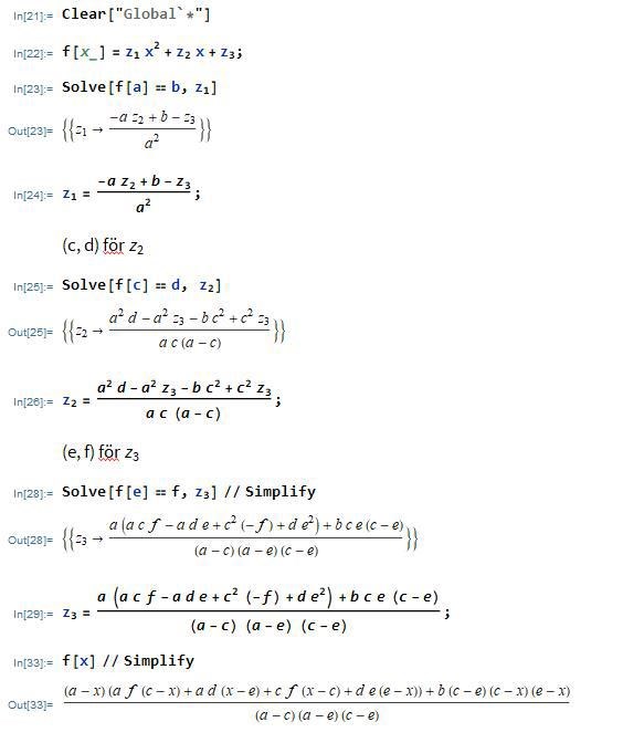 Bestäm andragradsfunktion genom tre punkter (a, b), (c, d) och (e, f)