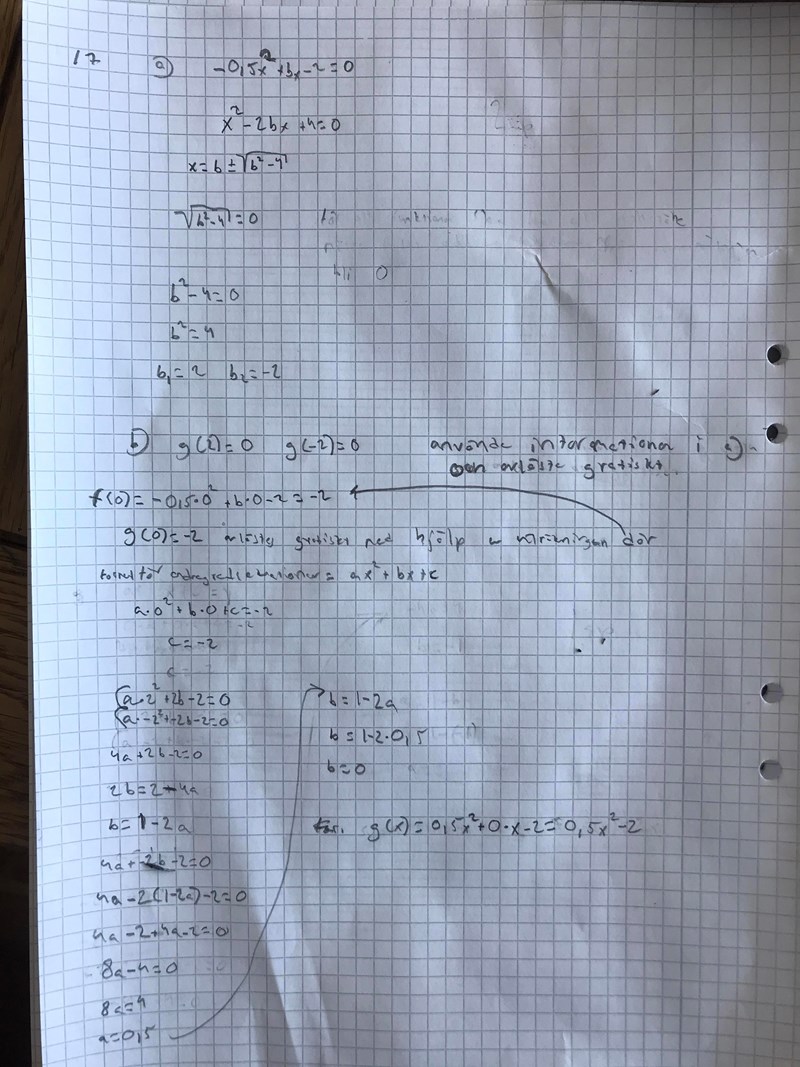 Du använder det du fick fram i a, att g(-2) = g(2) = 0, och det är korrekt, men borde nog motiveras.
