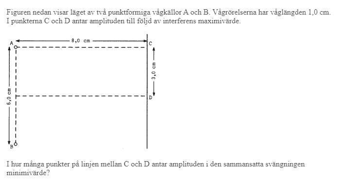 Hoppsan, jag använder kanske inte rätt uttryck. Vad jag menar är att uppgiften ger oss att vi får max amplitud genom interferens i punkterna C och D. D.v.s skillnaden i gångväg är ett helt antal våglängder. För A-D och B-D är skillnaden noll, för A-C och B-C är skillnaden 2 våglängder.