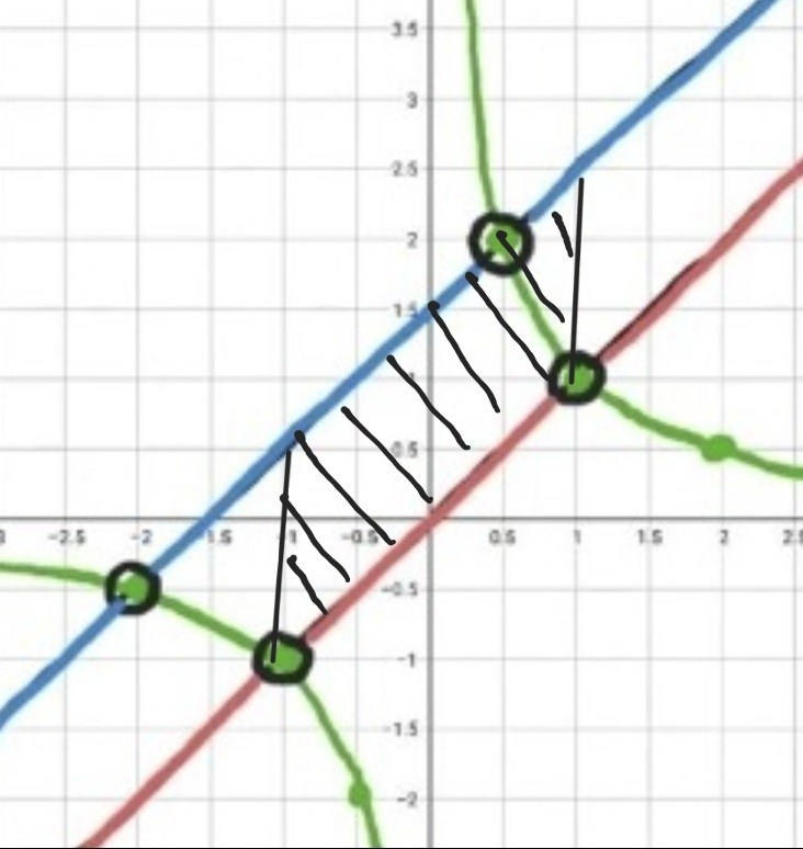Hur bestämmer man vilken som är övre respektive undre funktionen vid sådana fall för att bestämma området i mitten? Och hur långt vet man de sträcker sig? (övre och undre integrationsgräns) Fattar inte hur man gör här och hur man kan tänka allmänt.