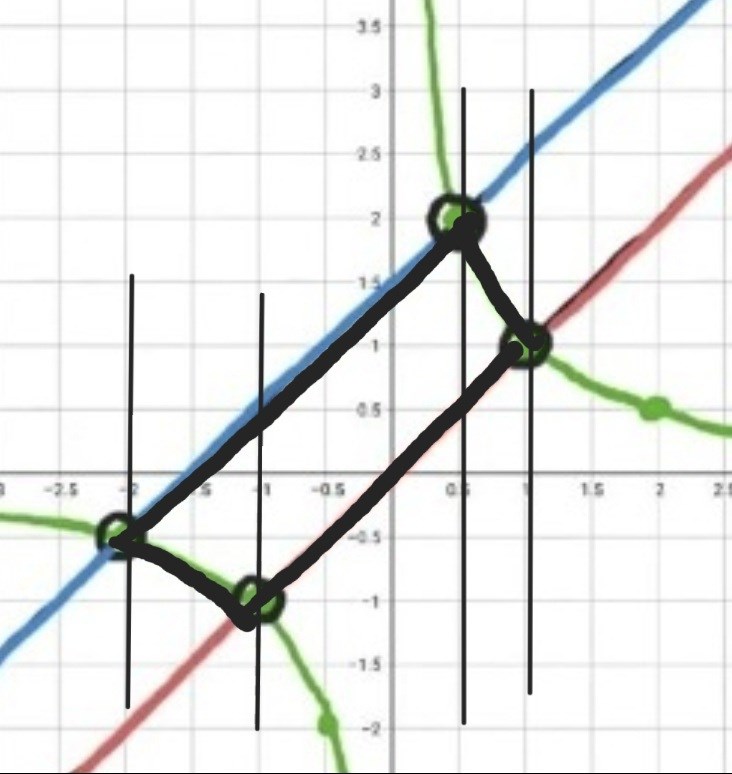 Det ör en förmåga som går att träna upp. Öva på att dela upp området i olika intervall med hjälp av vertikala linjer på ett sådant sätt att det I varje intervall endast är två funktioner inblandade: En "övre" och en "undre" funktion, se bild: