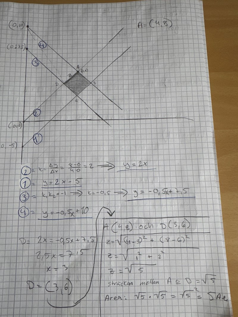 Den linje som går genom A och D går genom origo och har därför riktningskoefficienten ,vilket betyder att ekvationen för denna linje är .