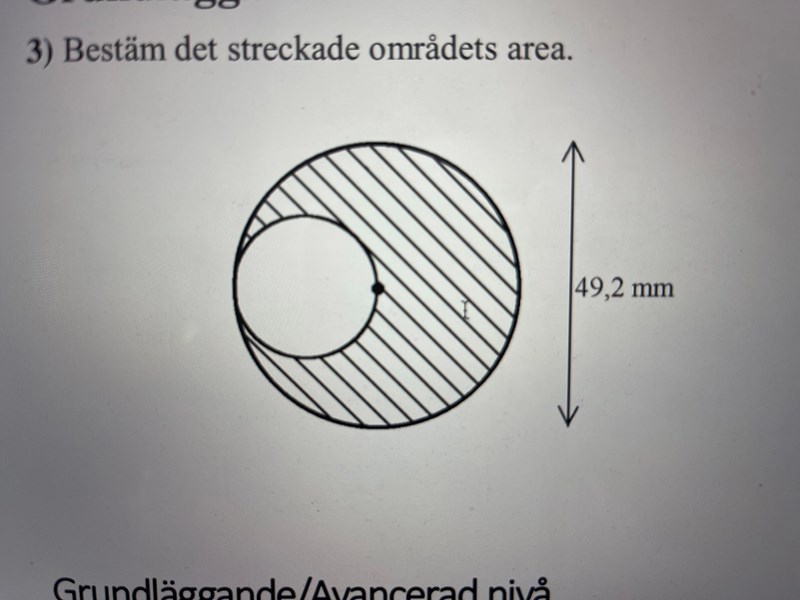Nja, radien på den stora är 24.6 mm ja. Sen ser man i bilden tack vare mittpunkten som är markerad, att den stora cirkels radie är lika stor som den lilla cirkelns diameter. Vad är då lilla cirkels radie, och sedan area?