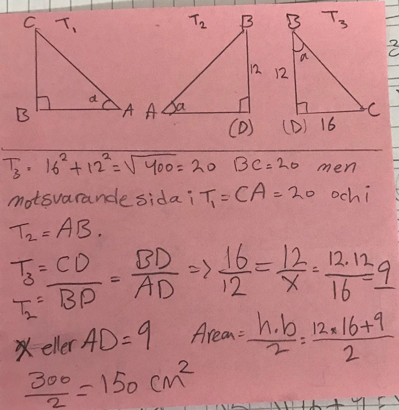 matsC skrev:Det är rätt - fast först tyckte jag det var fel eftersom jag titttat på de tre andra vinklarna som ju också är lika varandra. Nu när du vet att de är likformiga så vet du ju också att förhållandet mellan kateternas längder är lika i alla trianglarna vilket ger längden AD utan att du behöver Pytagoras till hjälp
