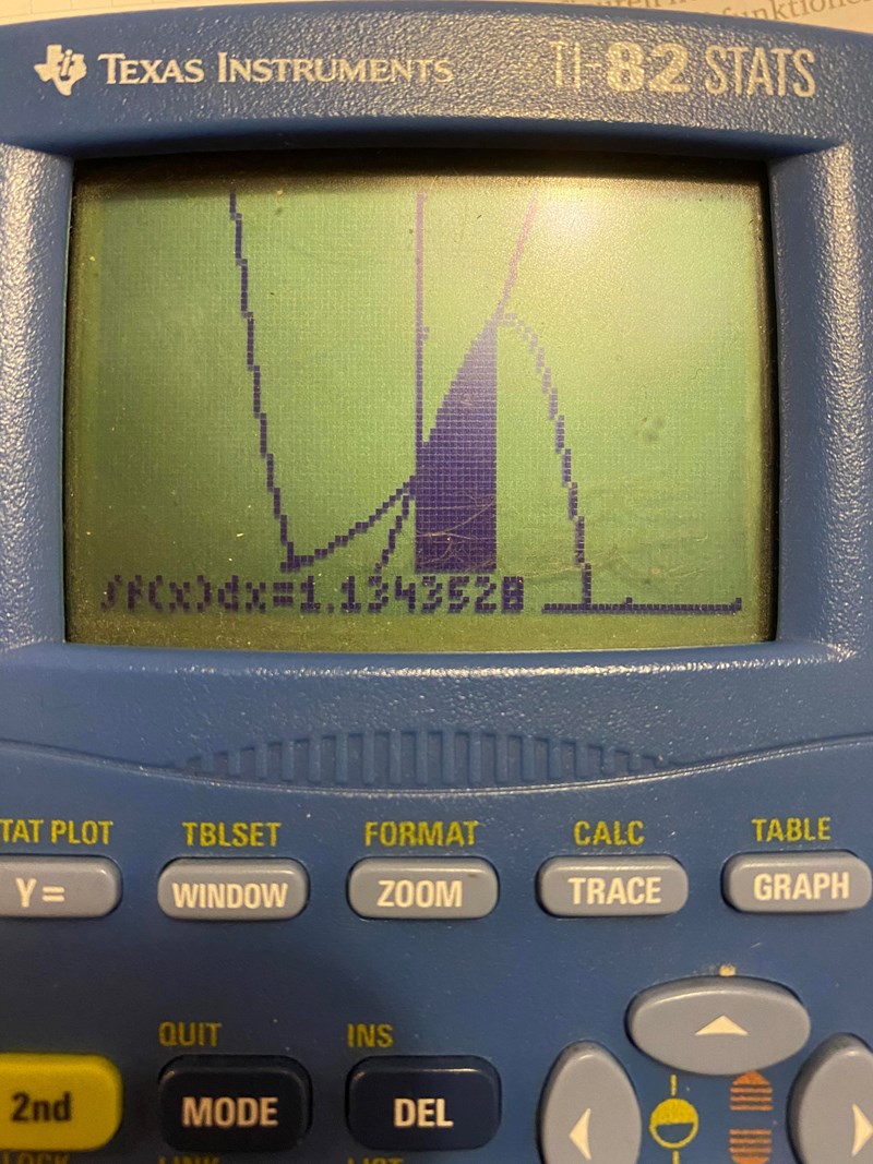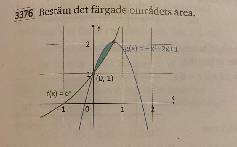 Ja, då den övre integrationsgränsen blir 0,72754023. Grafräknaren vill dock fortfarande inte räkna ut arean för just det området som boken vill utan den räknar arean för hela området under kurvan. Så det går nog inte? Får använda räknarens integralfunktion istället för att räkna ut svaret på denna uppgift.
