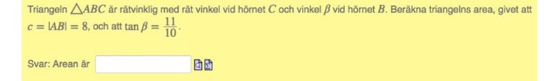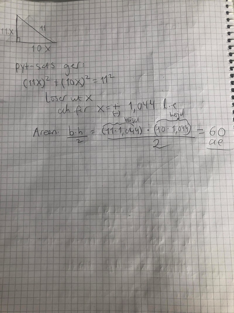 Börja med att rita en figur. Det är en rätvinklig triangel där hypotenusan har längden 11 l.e. och de båda katetera har längden 11x respektive 10x.Använd Pythagoras sats för att beräkna längden av de båda okända sidorna. De båda sidorna är vinkelräta mot vandra, så d är det lätt att beräkna triangelns area.