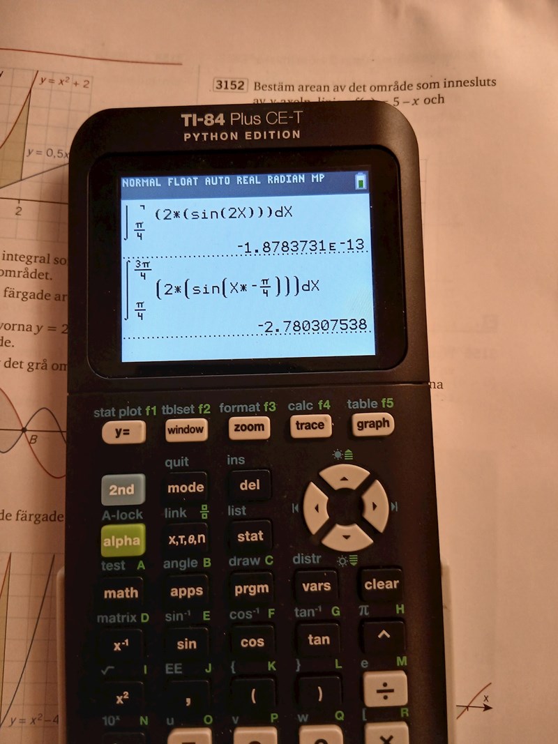 På min CG50 angav jag de två funktionerna, ritade dem, frågade efter integralen mellan 2 skärningspunker och den svarade 4. Vilket är rätt svar. Tog under 1 minut. Imponerande pryl.