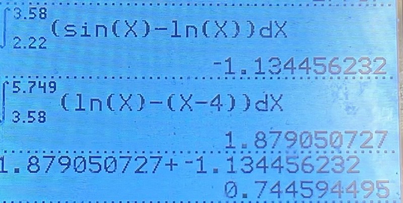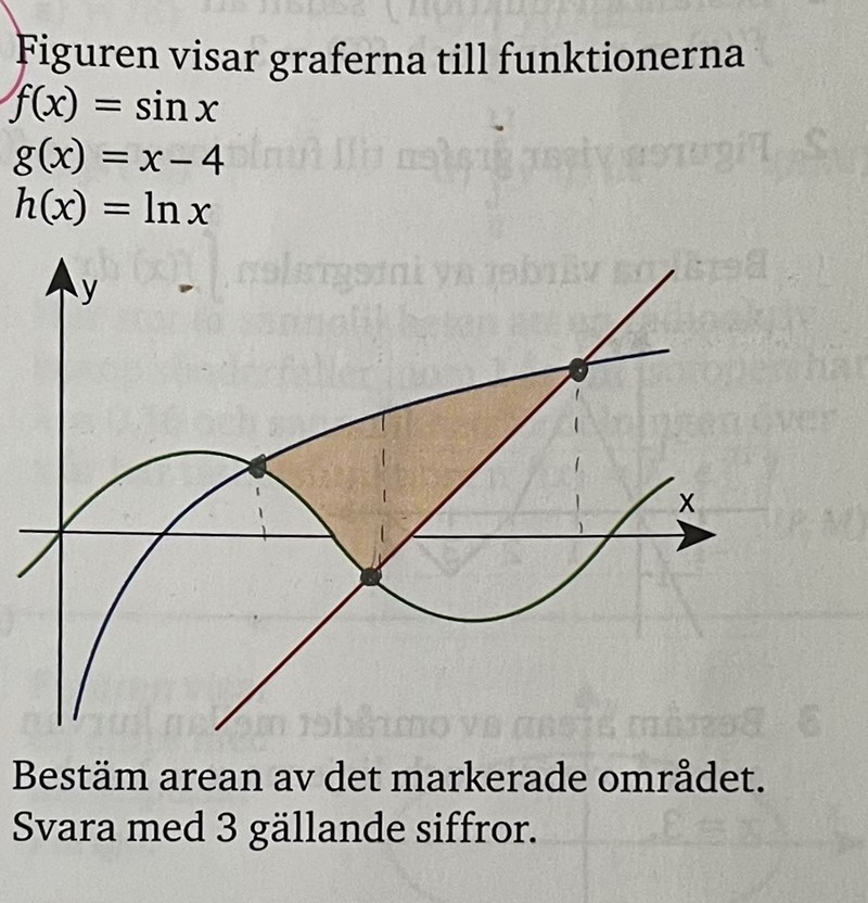 Jag håller på med uppgiften nedan. Jag försökte lösa den genom att beräkna skärningspunkterna (se bilden) mha min grafräknare. x = 2,22 är den första skärningspunkten, x = 3,58 är den andra skärningspunkten och x = 5,749 är den tredje. Sedan subtraherade jag funktionernas integraler med varandra. Jag får ändå fel svar. Se nedan hur jag gjort. Jag undrar vad det är för fel jag gör? Jag antar att jag kanske har subtraherat funktionernas integraler med varandra på fel sätt, men då blir min följdfråga hur ska jag då ska gå tillväga för att veta att vilka funktioner som subtraheras med vilka?