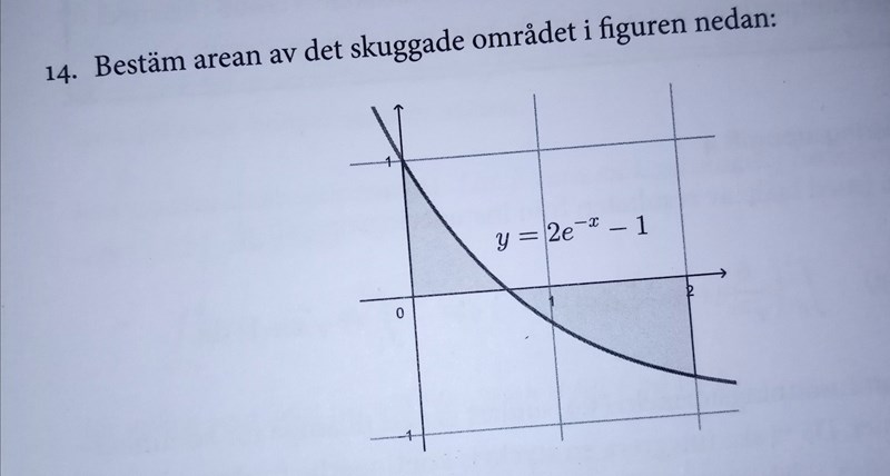 I intervallet ln(2)\ln(2) till 22 så är y=0y = 0 den "övre" funktionen och y=2e-x-1y = 2e^{-x}-1 den "undre" funktionen. Den arean blir alltså