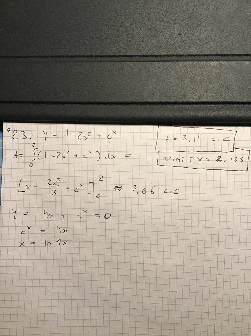 Enligt facit är arean 3.11 a.e och man får även ett poäng för att räkna ut att det finns en minimipunkt vid x = 2.153 men vet inte hur jag får fram något av dessa värde.