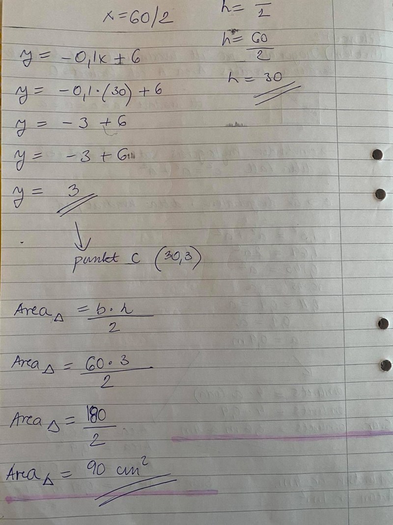 om du vill veta sista hörnets punkt måste du ta halva sträckan till hörnet i punkten (60,0) alltså x=30. Där har du x värdet för punkten för höjden. Om du stoppar in x=30 i funktionen y får du fram triangelns höjd och kan sedan beräkna arean.