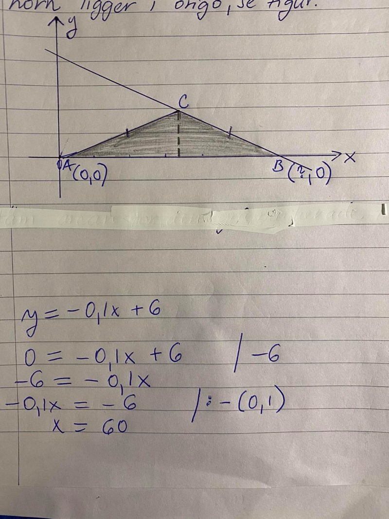 Så nu har jag bestämt punkterna A (0,0) och B (?,0)...koordinaten av punkten B på x-axeln räknade jag ut från y = - 0,1 x + 6 så här: