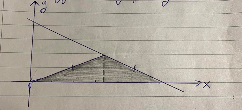 Den räta linjen borde vara y=-0.1x+6 eftersom lutningen är negativ (y minskar när x ökar). Då kan du bestämma basen av triangeln genom att räkna ut vilket värde på x som ger y=0. Sen kommer höjden vara på mitten av basen (alltså ditt x värde då y=0 delat på två). Vid de x värdet kan du med den räta linjen räkna ut höjden (y-värden för det x-värdet).