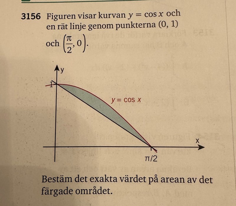 när jag väl försöker lösa integralen får jag svaret 2- (pi/2) vilket inte stämmer. Har jag tänkt rätt eller gör jag något räknefel? Tack