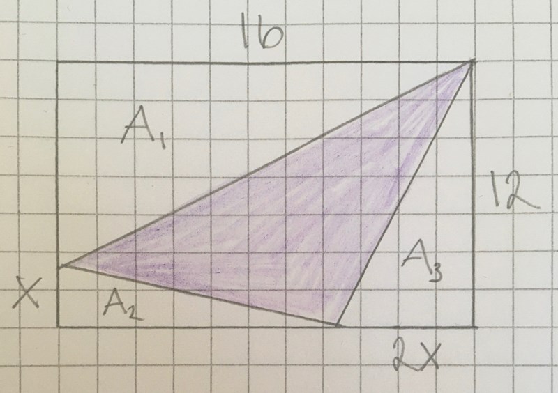 a) I rektangeln finns det tre vita trianglar. Bestäm arean av dess som en funktion av x.