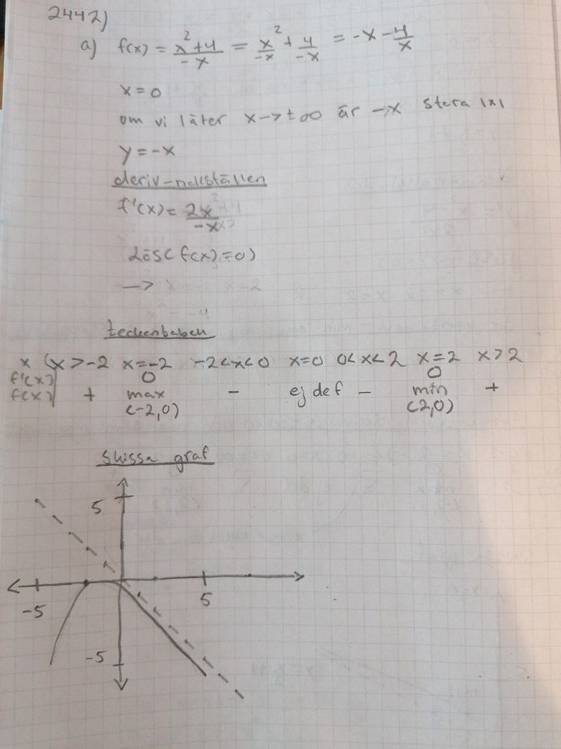 Du hade fått att f(x) = -x - 4/x. Kan du lista ut vad asymptoten blir då x går mot -?