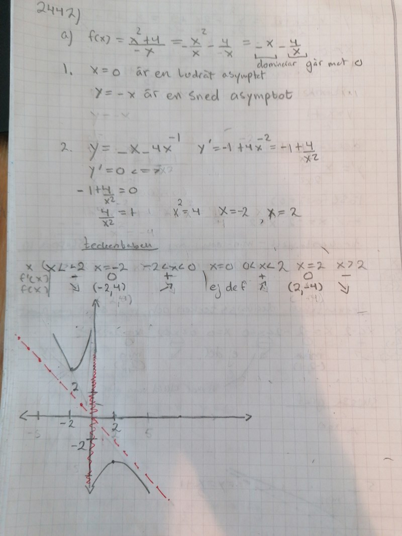 Du hade fått fram att f(x) = -x - 4/x. Kan du lista ut vad asymptoten blir då x går mot negativa oändligheten? Vilken term ”dominerar” för x-värden som är mycket mindre än 0?