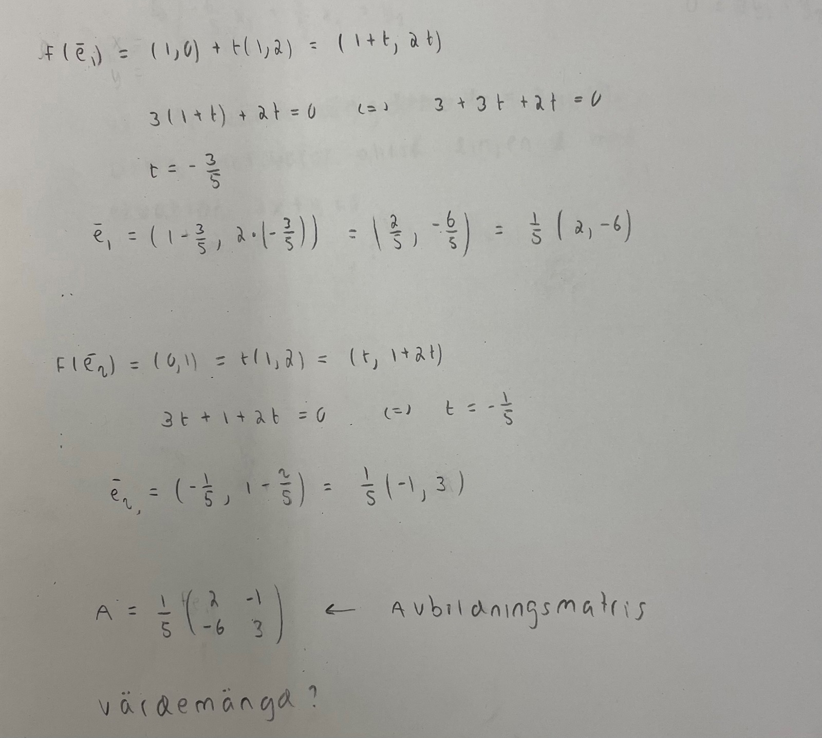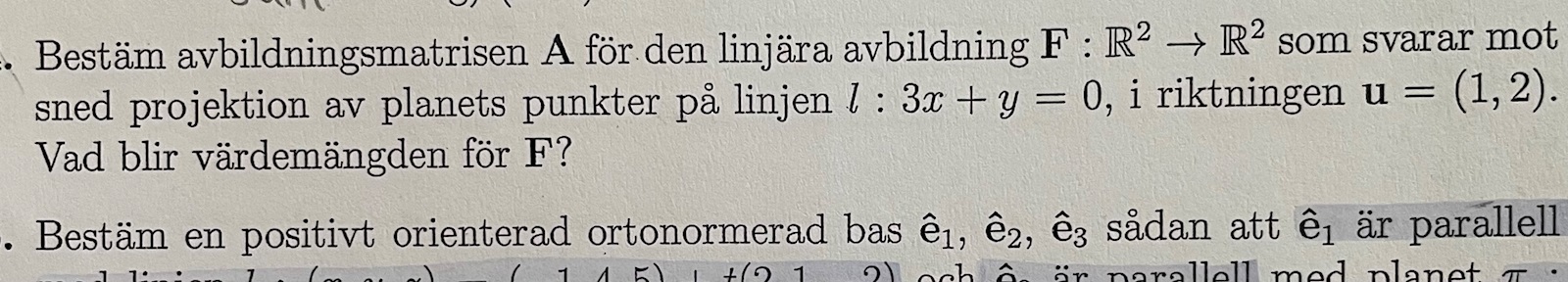 Bestäm avbildningsmatris sned projektion på linjen 3x+y=0 i riktningen u=(1,2)