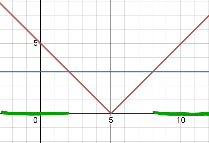 Lösningarna till olikheten |x-5| > 3 är alla de x-vörden för vilka grafen till y = |x-5| (röd graf) ligger ovanför grafen till y = 3 (blå graf). Det stämmer för alla x < 2 och för alla x > 8 (grönmarkerat i bilden):