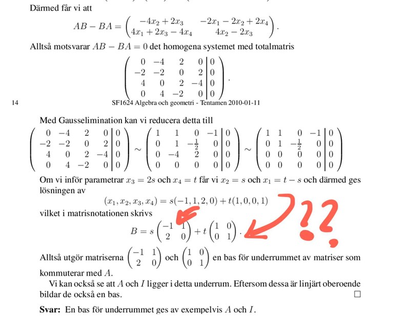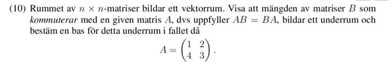 Det enklaste sättet tror jag helt enkelt är att ställa upp ekvationen för , och lösa för B. Du får fyra ekvationer, en för varje element i produktmatrisen. Bestäm sedan en bas för lösningen.