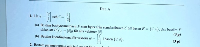 Jag förstår ej hur du kan skriva x i basen E som en linjär kombination av v och u? Och sen multiplicerar med okända konstanter som jag ej förstår varför du gör så. Sen undrar du vad vektorn u är i basen B. är det ej bara [2b1, b2]?