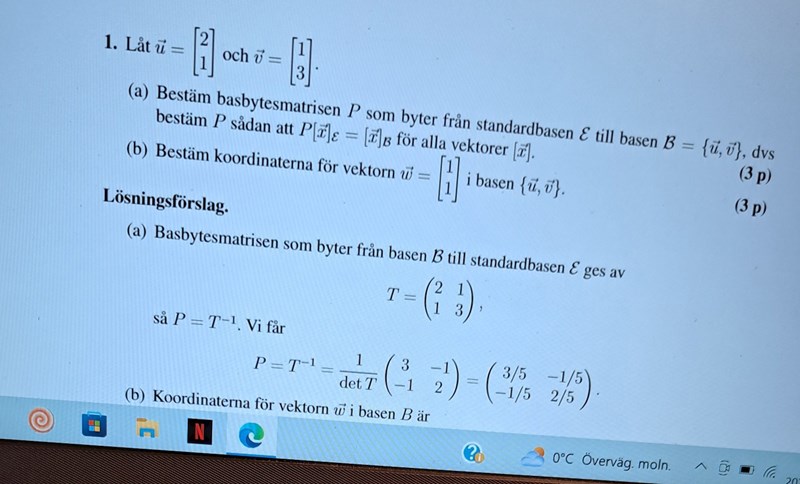 Notera den matris som du skrev först (#1) är PBE, dvs basbytesmatrisen från B till E. Men det som efterfrågas är PEB, dvs basbytesmatrisen från E till B.