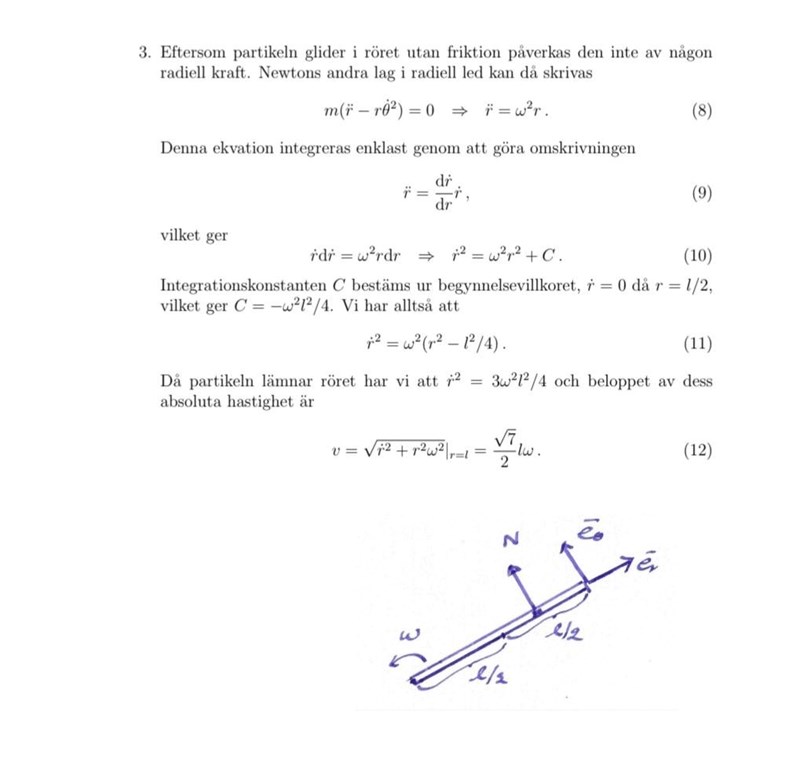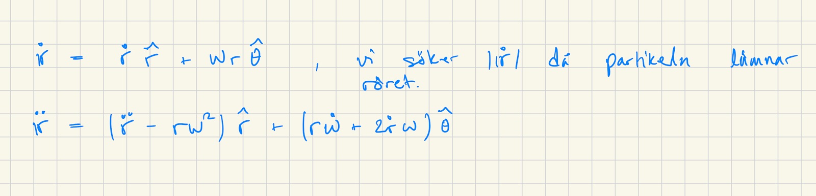 Härifrån identifierar vi att det är som behövs. Och för att få behövs för då får vi en diffekvation som vi kan lösa med det fina knepet (det är också det lösningsförslaget gör). Men först behöver vi ett uttryck för . Det är kanske inte helt självklart men eftersom det inte verkar någon kraft i -led kommer (centripetalaccelerationen). (Detta får någon annan gärna förklara vidare. Det skaver i huvudet att den totala radiella accelerationen blir 0 när den accelererar utåt. ) Därefter är det iaf att använda knepet ihop med begynnelsevillkoren så är uppgiften klar.
