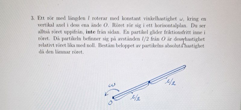 Jag körde fast på denna problem när jag var på väg att ställa upp energiprincipen framför allt lagen om kinetiska energi dvs Tstart=Tslut eftersom partikelns hastighet relativt röret är ju 0 och det sker ju då v= l/2*w. Men jag är osäker på om det är något mer man ska tänka på såsom tangialacceleration och normalacceleration i detta problem.