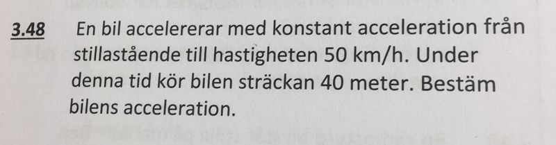 Två variabler kanske, men också två ekvationer. Först vet du att bilen accelererar från 0 till 50 km/h. Då kan du använda formeln för sluthastighet under konstant acceleration: :