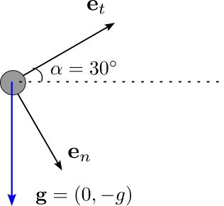 Jag lyckades bara komposantuppdela i en komponent parallellt med g och en annan komponent vinkelrät mot g dvs vsinalfa och vcosalfa. Sen vet jag inte hur jag ska rita e_t och e_n här för att komma vidare.