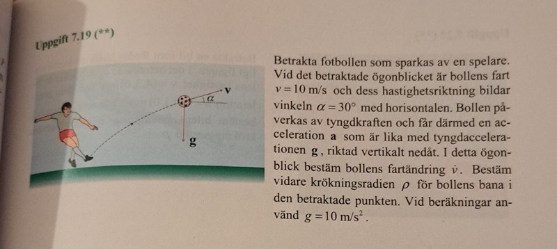 Bestäm bollens fartändring i detta ögonblick samt krökningsradie