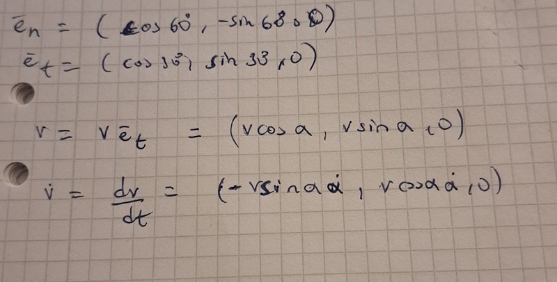 Jag känner inte att jag förstår varför du projicerar a i e_t samt a i e_n. Det här var inte det jag ville göra riktigt. Jag trodde v=vet var en vektor där v är beloppet vi har fått givet från uppgiften och vi behöver bara multiplicera den med enhetsvektor i tangentiell riktning och sen derivera vektorn v map tiden.