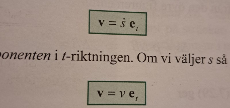 Det här hittade jag i kursboken. Det känns rimligt att multiplicera v (beloppet) som är angiven i uppgiften med e_t och sen derivera den komponenten?