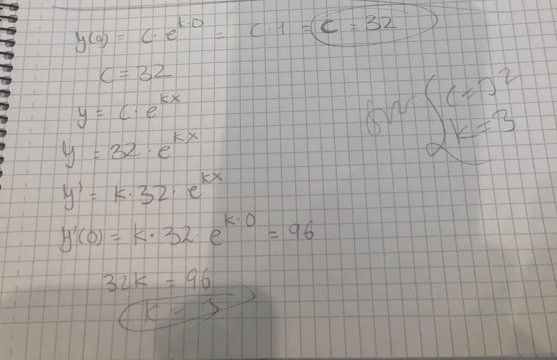 Bestäm C och k om vi vet att y(0)= 32 och att y′(0) = 9ksh fick svaret