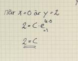 kurvan y = Cekx går genom punkten (0,2) och har där lutningen 3. Bestäm C och K
