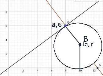 En cirkel tangerar linjen 3x-4y=0 i punkten (8,6). Den tangerar dessutom den positiva x-axeln. Bestäm cirkelns medelpunkt och radie.