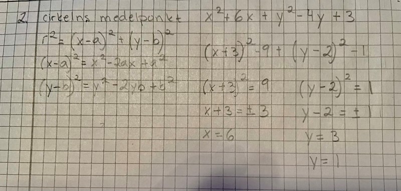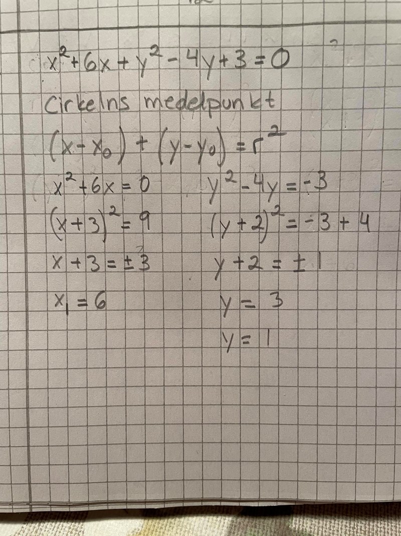 Så x2+6x+y2-4y+3 = 0 är ekvivalent med (x+3)2 + (y-2)2 = 10