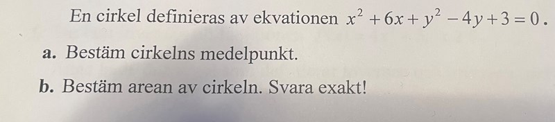 Du har ekvationen x2+6x+y2-4y+3 = 0. Du vill komma fram till en ekvation som ser ut som (x-x0)2+(y-y0)2 = r2.