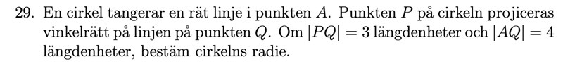 Bestäm cirkelns radier när |PQ|=3l.e. och |AQ| = 4l.e.