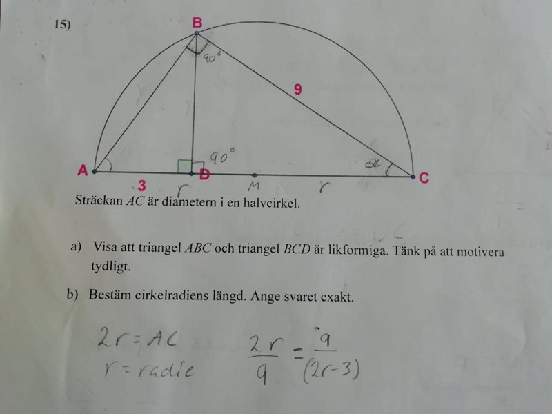 b). facit visar att radien är (3+√333)/4. Gissa sig fram typ och den ekvationen vi kom fram till visade rätt svar fast ingen av satserna vi egentligen ska använda för att lösa problemen passar in, först antog jag att det var cosinus men vi hade inte vinkeln klar.