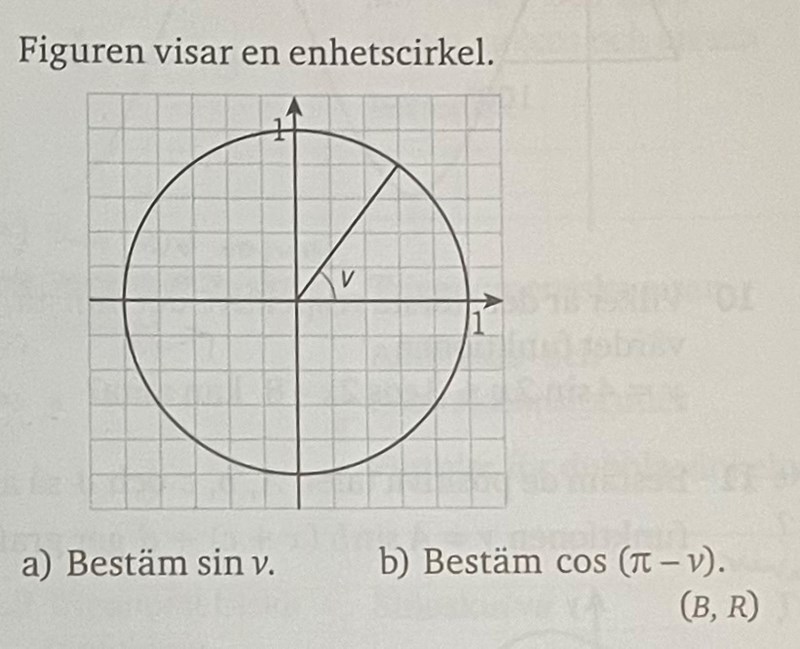 Jag håller på med uppgift b) och vet inte riktigt hur jag ska gå tillväga. Jag vet att cos(pi) = -1 och att cos(-v) är vinkeln som är uppritad i enhetscirkeln men spegelvänt medurs. Jag vet dock inte hur jag ska ”slå ihop” denna info för att lösa uppgiften. Jag uppskattar all hjälp!