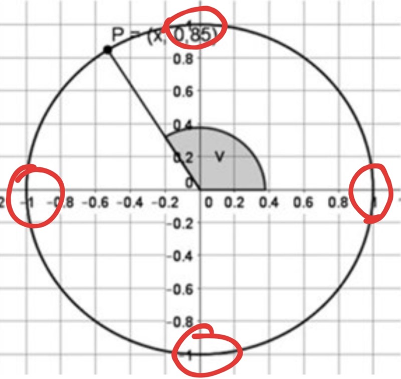 Helt enkelt har den radie 1, eftersom radien är konstant i en cirkel. Detta betyderär du bara behöver kolla på vart den skär någon av axlarna. Det du har framför dig är alltså enhetscirkeln och då vet vi att . Sinv är redan given i uppgiften, eller hur?