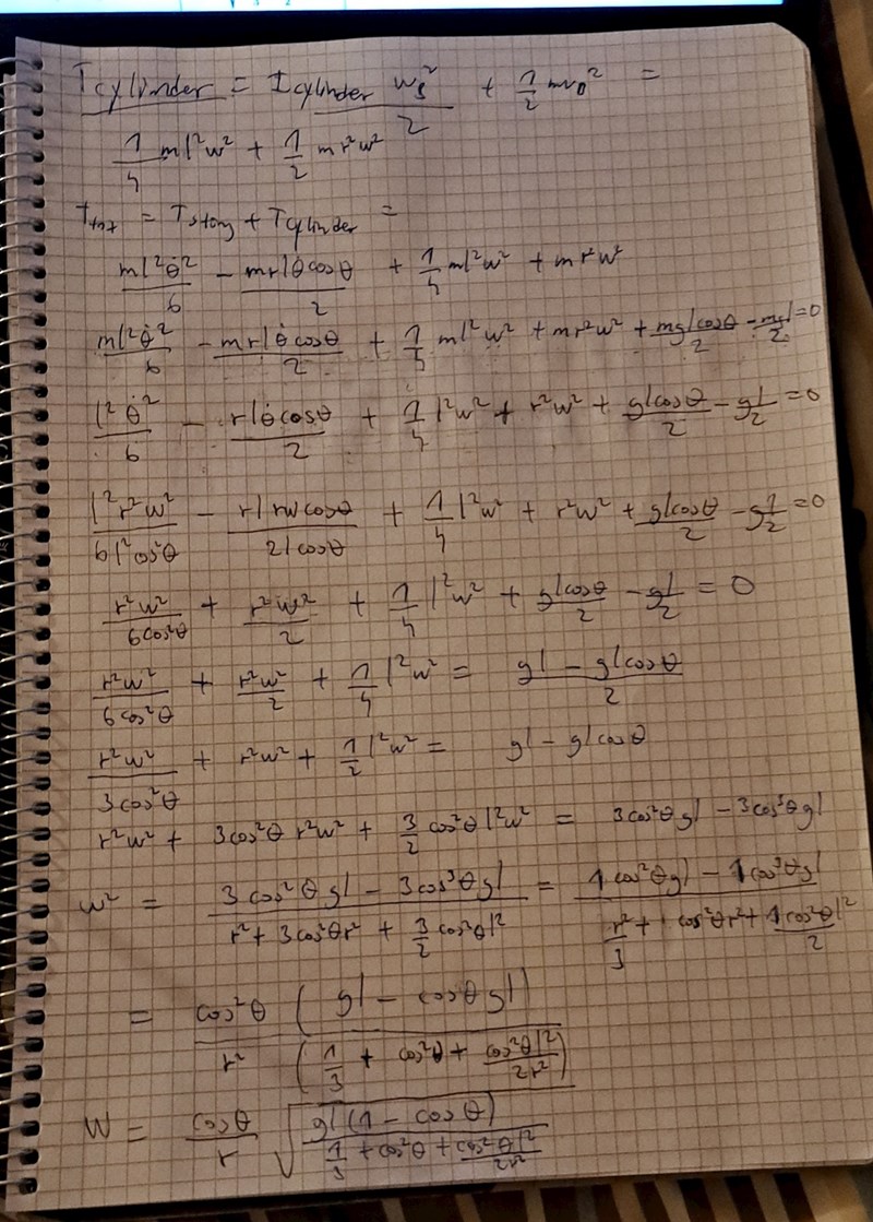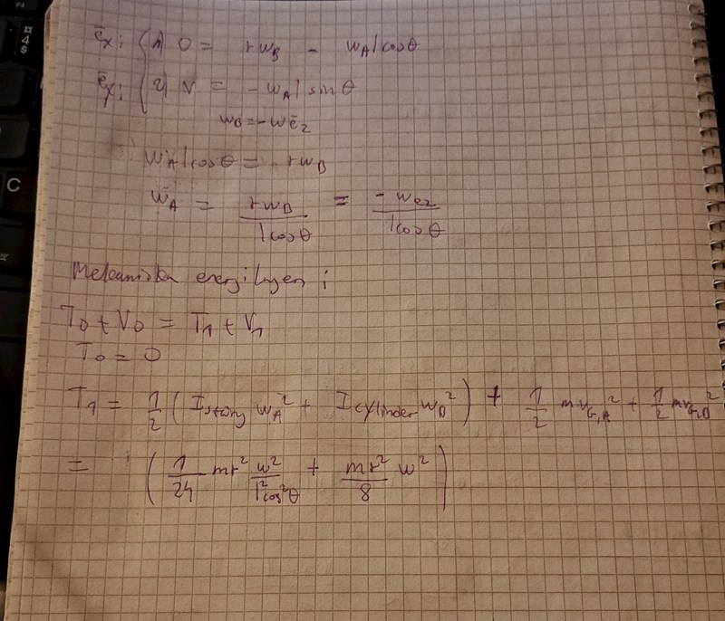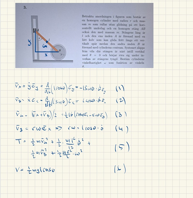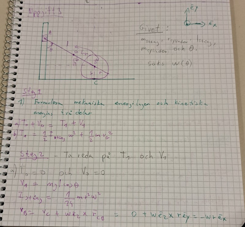 Ja juste om vi vill ha T1=1/2Iw^2 så behöver vi ha w_A uttryckt i w för den kinetiska energi består inte bara av den delen utan även mv_g^2/2 men v_g är ju stångens  och cylinders masscentrums hastighet. Isåfall är det bättre att ha w_A uttryckt i w för det andra sättet med att få ut w låter bara lite jobbigt tidsmässigt.