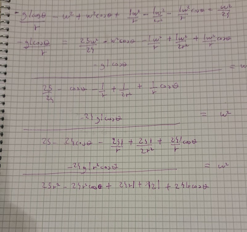 Tänk på att det går ut på att räkna ut w, så det är lämpligt om du uttrycker den kinetiska energin i termer av w. Om du använder v istället så får du först räkna ut vad v skall bli som funktion av theta och sedan räkna ut w från 2). En smaksak.