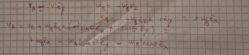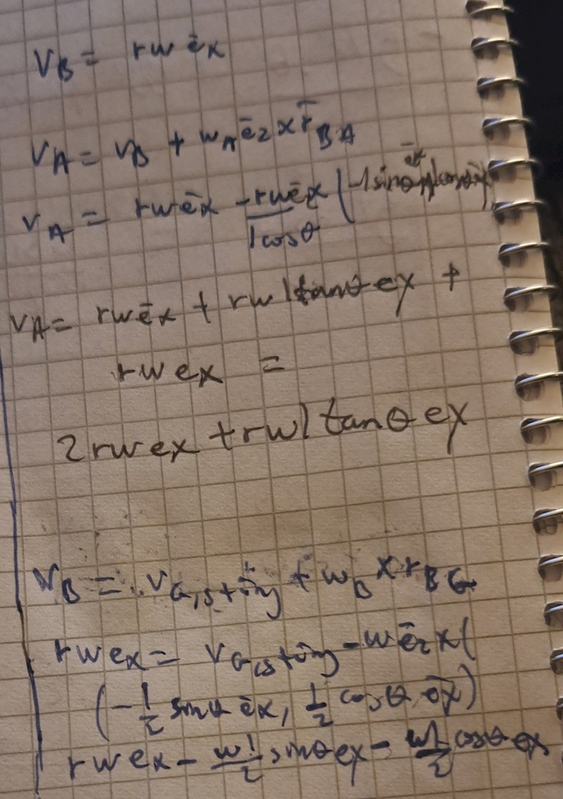 Nu hänger jag inte med på hur du får v_A och v_B. Om man tillämpar den där satsen där kroppen är stelt förenad med marken där vc=0 så kan man ju få fram v_B=v_c+wez×r_CB och då får vi v_B=-rwex. Gällande v_A så får jag v_A=v_B+wez×(lcosthetaex, lsinthetaey) =-rwex+wlcosthetaey-wlsinthetaex. Är detta korrekt?