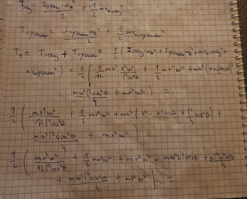 Men när det gäller energibetraktelser , om stångens har T_stång= Istång*w_A^2/2+1/2*mv_gstång^2 så behöver vi ställa upp T_cylinder och sen addera ihop totala kinetisk energi för hela systemet?