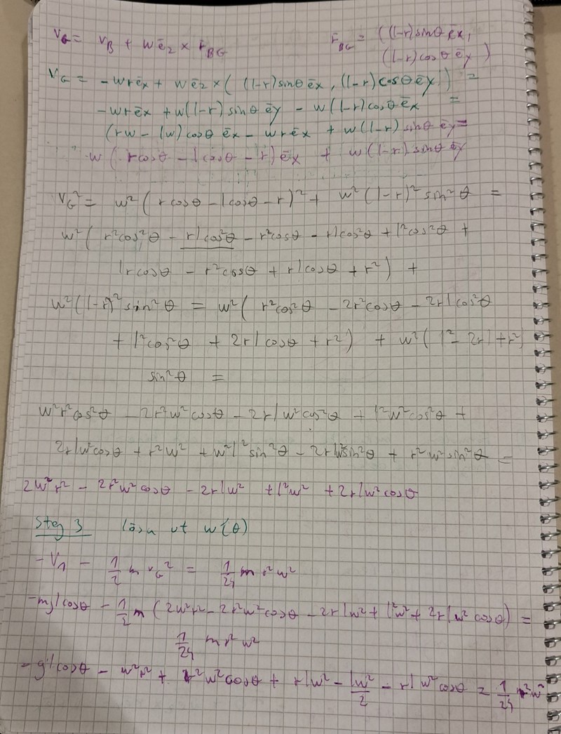 Ok jag förstår inte riktigt vad du gör för att hitta v_G. Men jag antar att man ska hitta (x_g och y_g) som funktion , sen derivera och summera dem och ta sqrt av dessa för att få v_g.  Du har inte besvarat på min fråga i #33 gällande stångens vinkelhastighet.