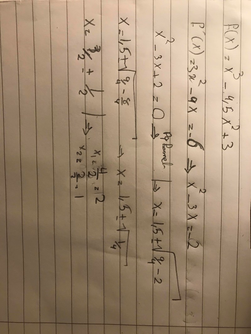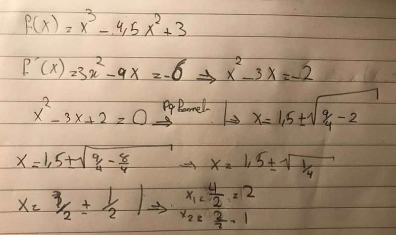 Om du kollar på hela bilden så ser du att jag för enklade första derivatan, sen flyttade -2 til andra sidan och fick x2-3x+2 = 0, vilket man kan lösa x genom pq-formeln