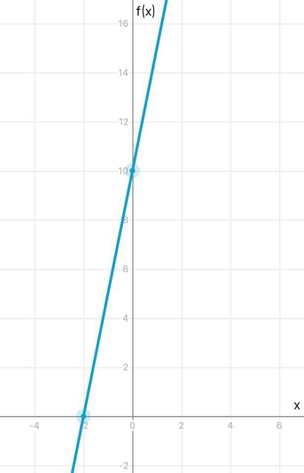 f (x) = 5x + 10 ger x skärning -2 samt y skärning 10.